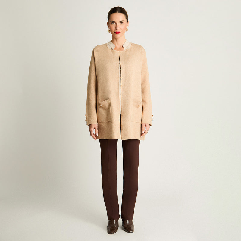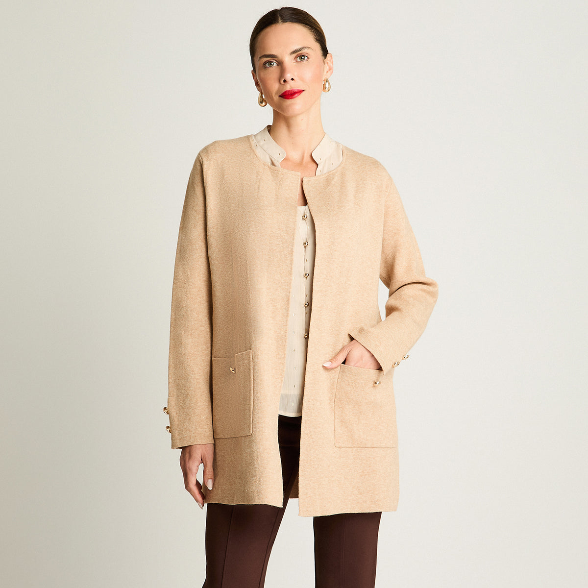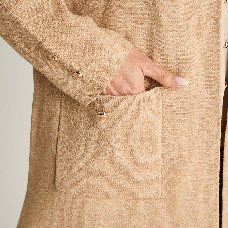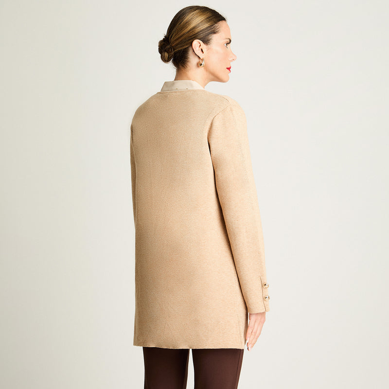 Este tapado tejido de manga larga con bolsillos dorados es la combinación perfecta de estilo y comodidad. Con una composición de 50% viscosa, 28% poliéster y 22% poliamida, este tapado te mantendrá abrigado mientras luces elegante y sofisticado en cualquier ocasión. Su suave textura y durabilidad lo hacen una opción versátil y práctica para tu día a día.