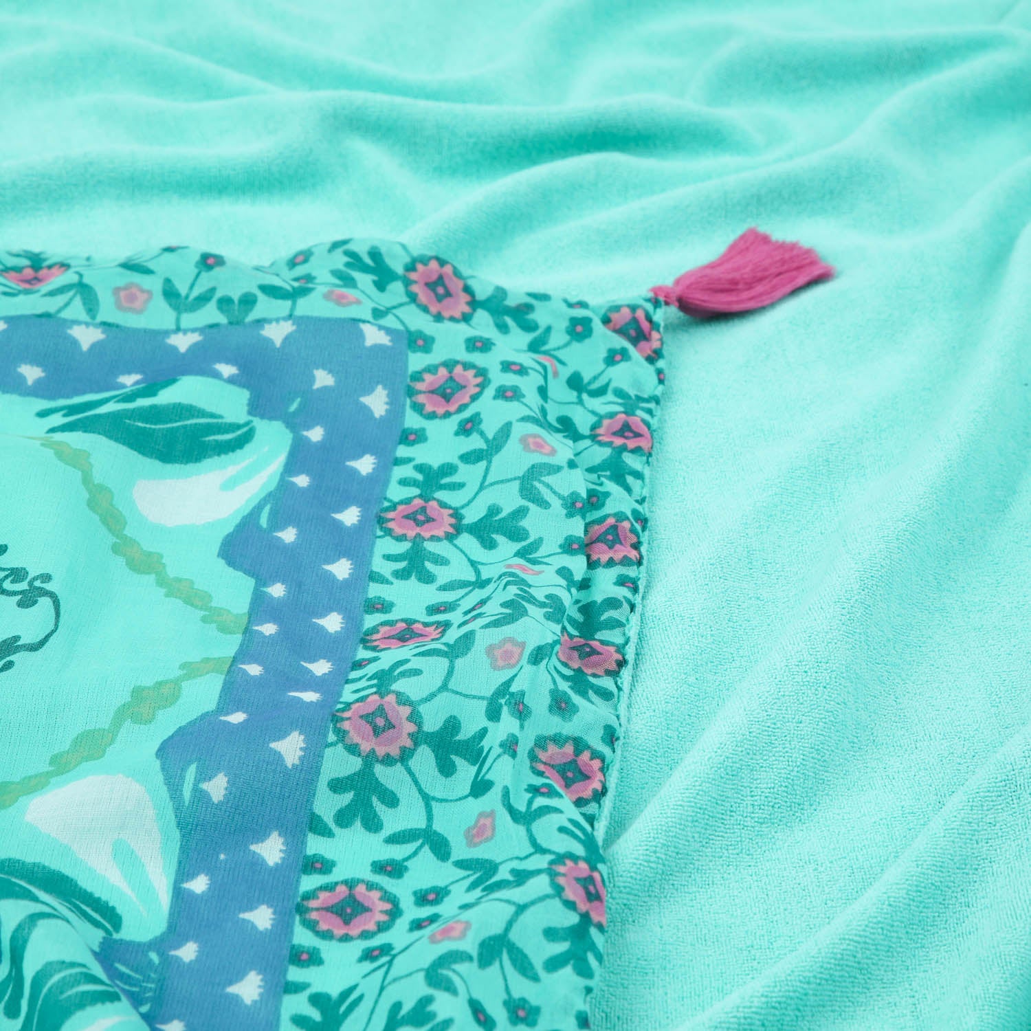 Toalla reversible en tono verde, con un diseño floral geométrico estampado en algodón 100% por un lado, y un reverso de suave microfibra en color a juego. Cuenta con elegantes borlas tejidas en morado que aportan un toque distintivo.