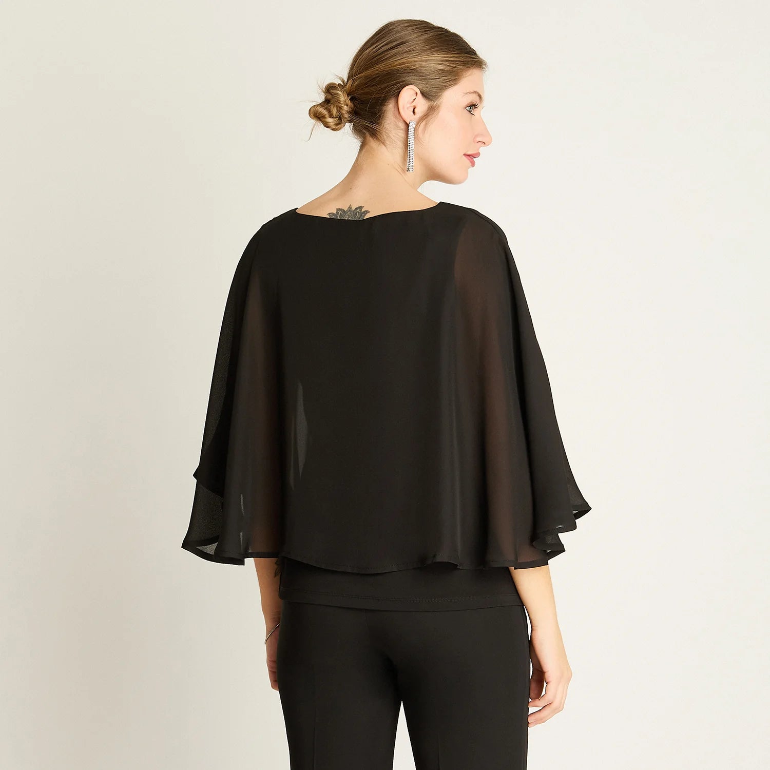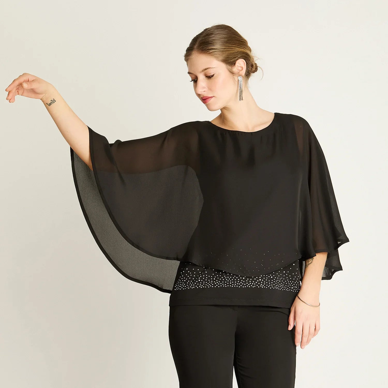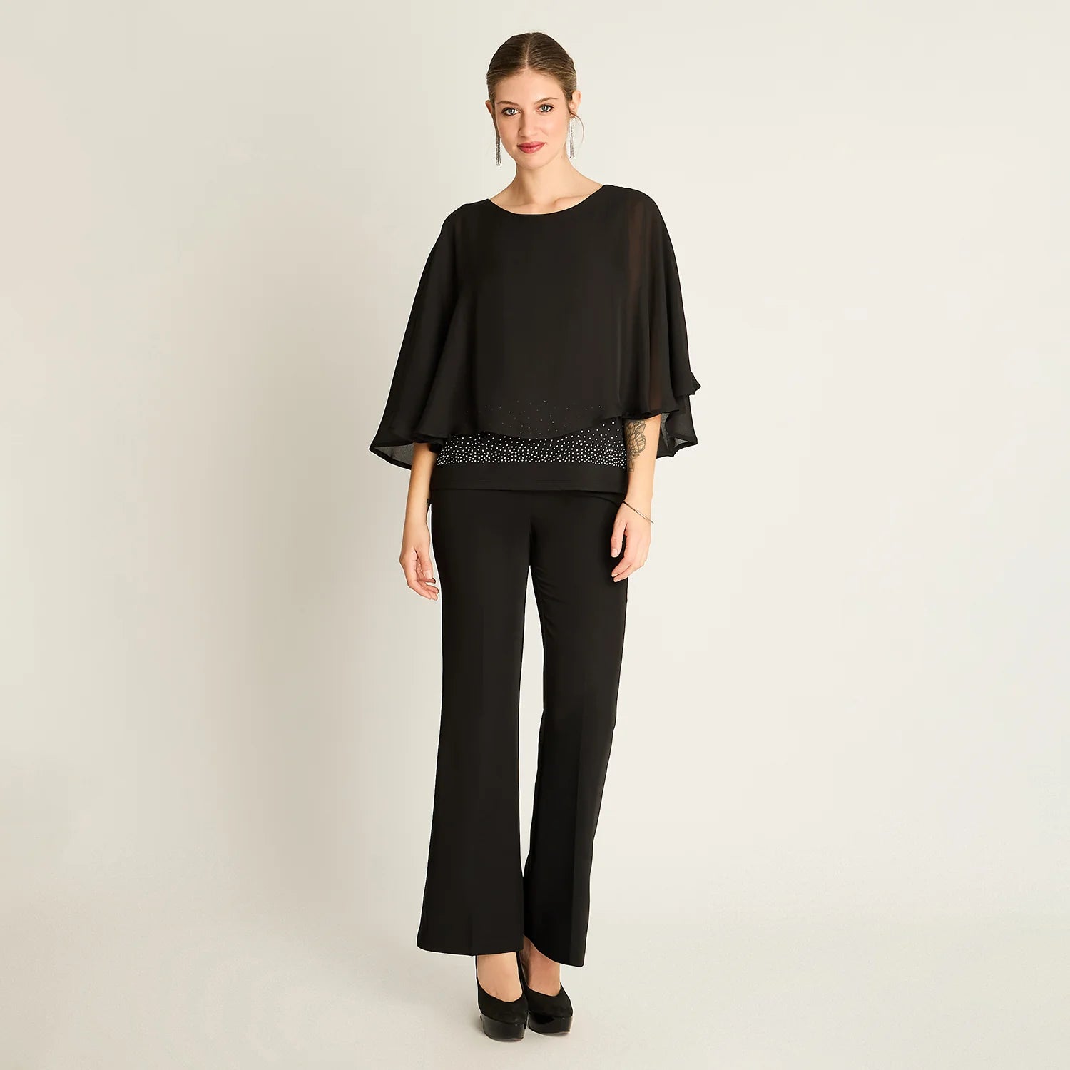 Descubre la Túnica Negra con Brillos de Lorenzo di Pontti, una prenda que combina elegancia y comodidad para tus noches de primavera. Su diseño de doble capa con efecto envolvente y sutiles brillos en el bajo ofrecen un look femenino y moderno. Confeccionada en poliéster y spandex, brinda elasticidad media y un ajuste favorecedor sin perder ligereza. Ideal para combinar con pantalones ajustados o faldas midi, esta túnica es la elección perfecta para destacar con sofisticación en cualquier ocasión especial.