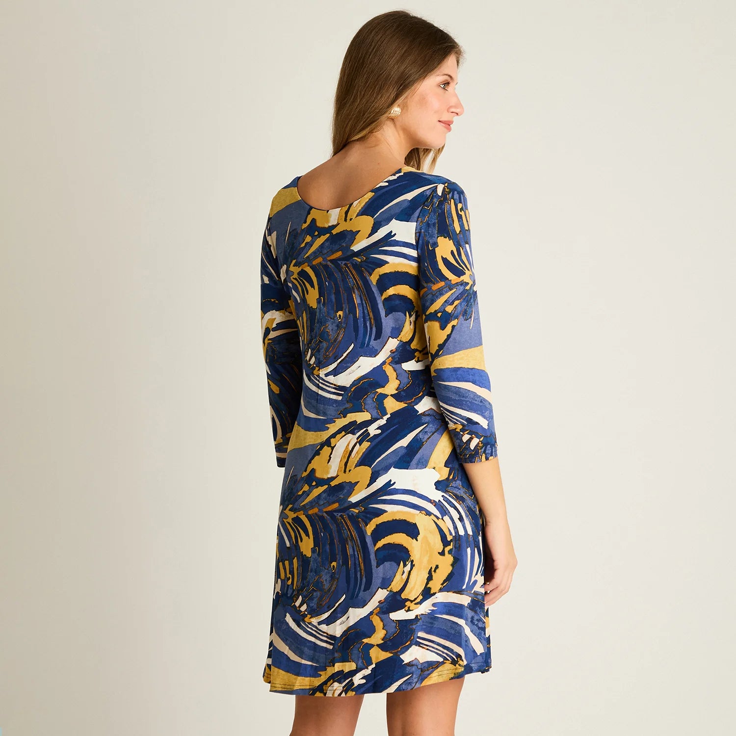 Descubre el vestido corto azul estampado de la colección Best In Blue de Lorenzo di Pontti, perfecto para llenar tu primavera de color y estilo. Su vibrante estampado artístico en tonos azules, mostaza y blanco aporta energía y personalidad, mientras su calce normal y elasticidad media garantizan comodidad y libertad de movimiento. Con mangas 3/4, cuello redondo y forro interior, este vestido combina frescura y sofisticación para cualquier ocasión diaria. Siente la comodidad y la elegancia en cada paso con esta prenda imprescindible para tu guardarropa.
