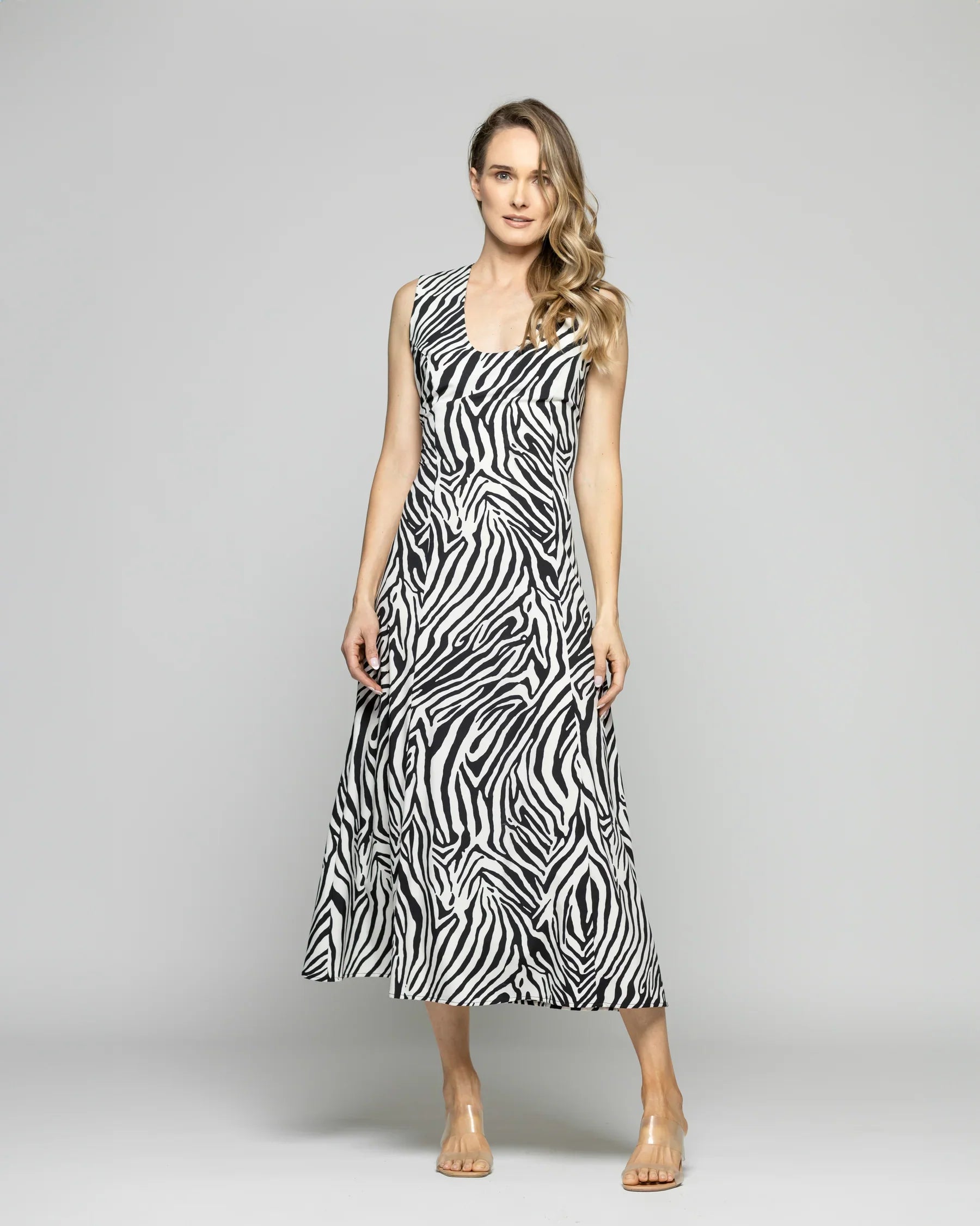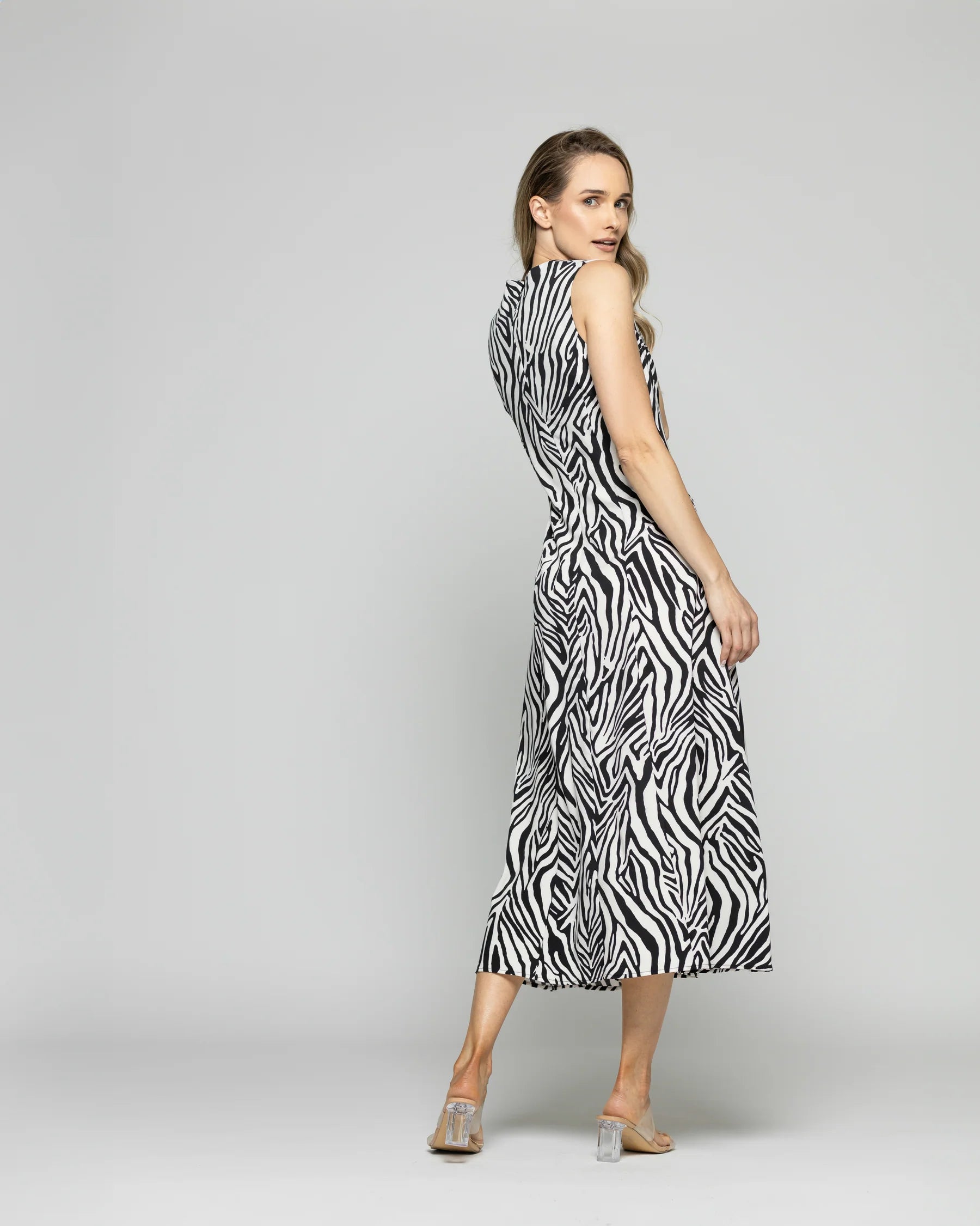 Vestido Mujer Vanda Midi Sin Mangas Animal Print Cebra Blanco Y Negro Ludovica