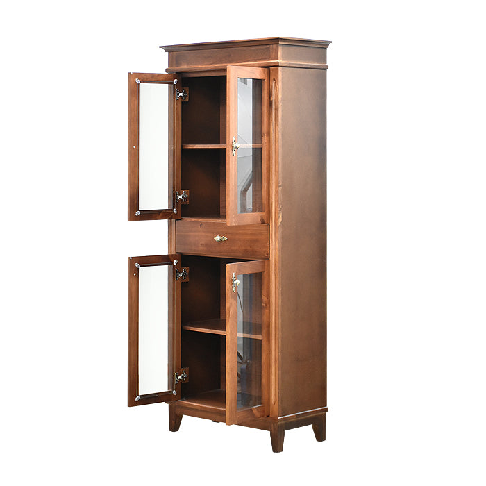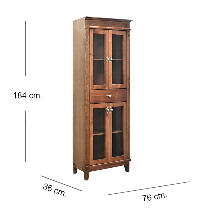 La Vitrina 4 Puertas Trinidad combina funcionalidad y estilo rústico con un diseño artesanal único de la Región de La Araucanía. Fabricada en madera sólida de pino radiata, ofrece cuatro puertas con estantes y repisas, además de un práctico cajón central con tirador metálico, ideal para organizar y exhibir tus objetos con elegancia. Sus dimensiones compactas (76 cm de ancho, 36 cm de profundidad y 184 cm de alto) la hacen perfecta para cualquier espacio, aportando calidez y versatilidad que se adapta tanto a estilos contemporáneos como clásicos. Dale un toque acogedor y natural a tu hogar con esta pieza exclusiva.